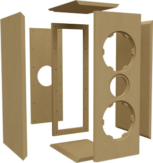 Vergrößern Das Gehäuse ist nun fertig zusammengebaut. Alle Flächen werden geschliffen und der gewünschte Lack bzw. das Furnier wird aufgebracht. Wenn das Gehäuse fertig lackiert ist, können die Chassis mit der Frequenzweiche verbunden und in das Gehäuse eingeschraubt werden.