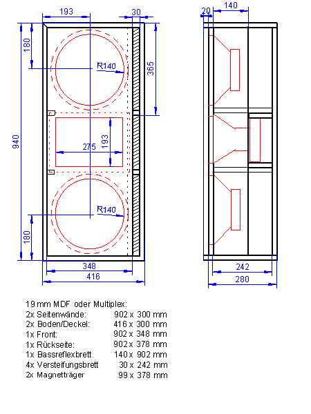Satellite application: in case the loudspeaker is always used in conjunction with a subwoofer, the bass reflex port may be omitted. The cabinet may then be build to a size just big enough for accommodating the drivers. Even with its small 44 litre trapezoid cabinet the frequency range starts at 60 / 100 Hz (at -8 / -3 dB). Woodworking experts prefer to build a trapezoid cabinet: either with 5 degrees angle on both sides or 10 degrees on one side (opposing the side where the bass reflex port is). The cabinet's rear wall will then be 4.9 mm smaller than the baffle. In order to keep the same volume the cabinet should be made 3.5 cm deeper, resulting in a real wall that is 5.6 smaller than the baffle.