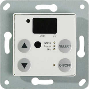 Infrarot-Tastmodul mit Display. Anschluß am DAM LS-Lautsprechermodul zur Bedienung der DAM-Hörzone über die Tastatur oder per Infrarot-Fernbedienung. Einfache Bedienung über 4 Tasten für die wichtigsten Funktionen. Mit dem Select-Button wird zwischen "Volume", "Source" und "Skip" gewählt. Die Skip-Taste schaltet je nach Tonquelle z.B. auf den nächsten Titel oder den nächsten Sender. Mit der On/Off-Taste kann entweder nur die Zone (kurzer Tastendruck) oder das ganze DAM-System (langer Tastendruck) ausgeschaltet werden (zweitgenannte Funktion kann deaktiviert werden). Die Folientastatur des DAM IR ist 50x50mm groß und passt mit im Elektro-Fachgroßhandel erhältlichen Adapterrahmen zu nahezu allen gängigen Schalterprogrammen. Das DAM IR ist weiterhin mit einem Kopfhörerverstärker bestückt, welcher an der optional erhältlichen Kopfhörerbuchse DAM-HP angeschlossen werden kann.
