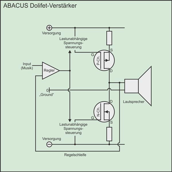 Die Dolifet-Schaltung funktioniert vom Prinzip genauso, wie die bipolare ABACUS-Schaltung (linke Abbildung). Da Feldeffekttransistoren jedoch Spannungsgesteuert sind, im Gegensatz zu den stromgesteuerten bi-polaren Transistoren ist die Ansteuerung einfacher und es lassen sich höhere Bandbreiten realisierten. Außerdem benötigen Verstärker mit Feldeffekttransistoren keine aufwendige Temperaturkompensation.