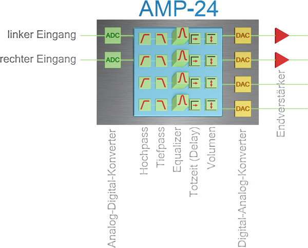 Das linke Bild zeigt den schematischen Aufbau vom integrierten DSP-24 im audaphon AMP-2500.