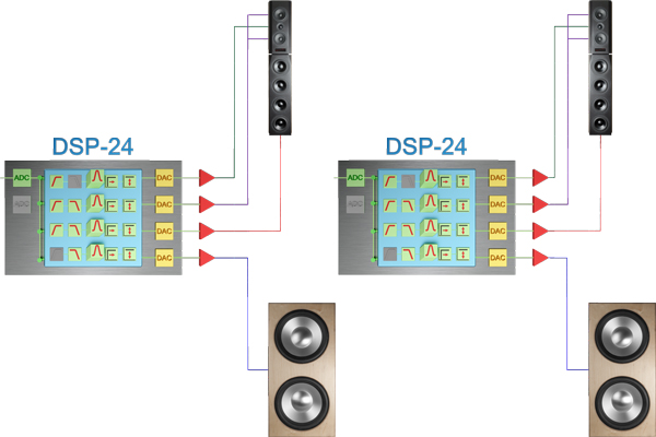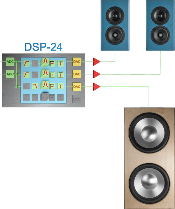 Bei Verwendung von einem Subwoofer wird der rechte und linke Kanal addiert und auf einen Ausgang gelegt. Es wird ein sogenanntes Summensignal gebildet. Somit bekommt der Subwoofer (DON) alle auf der Stereo-Quelle vorhandenen Tieftonsignale, egal ob diese tiefen Töne auf der linken oder rechten Spur gespeichert sind. Mit dem Delay, den Equalizern und der Lautstärkeanpassung werden die Komponenten aufeinander und den Raum (Raumakustik) angepasst.