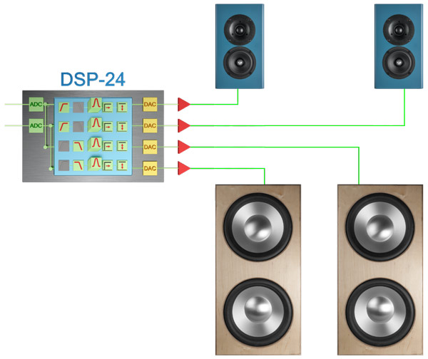 5) Verwendung als Frequenzweiche zur Ansteuerung von zwei Satelliten und zwei Subwoofern: