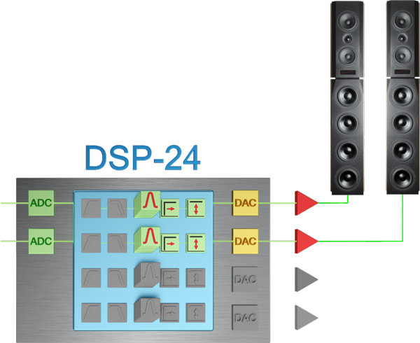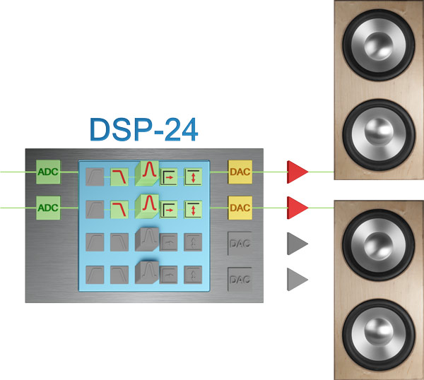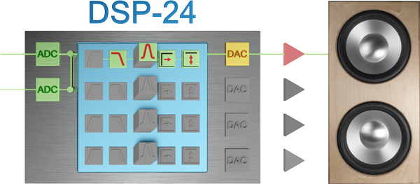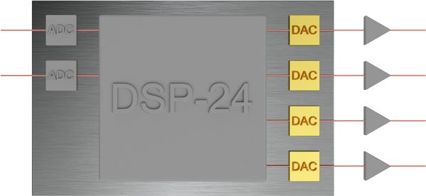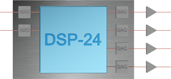 Im audaphon AMP-2500 ist ein DSP-24 integriert. Die Buchstaben DSP stehen für Digitaler-Signal-Prozessor. Somit wird im Audiobereich auch von Digitalen Sound Prozessoren gesprochen. Ein DSP bietet eine Vielzahl von Einstell- und Korrekturmöglichkeiten für Lautsprecher, die rein analog nicht bzw. nur mit unvertretbar hohem Aufwand zu realisieren wären.