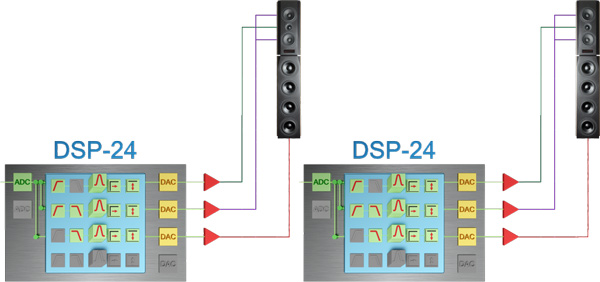 Mit dem audaphon AMP-2500 lassen sich verschiedene Konfigurationen aufbauen. Die Bandbreite reicht von der Aktivierung von einem Vollbereichslautsprecher, über teilaktive Lautsprecher bis zu vollaktiven Lautsprecher-Lösungen. Vorhandene Lautsprecher lassen sich dank des audaphon AMP-2500 und dem integrierten DSP optimal an den Hörraum anpassen. Raumresonanzen, stehende Wellen, klangverändernde Reflexionen usw. können neutralisiert und im besten Fall vollständig beseitigt werden. In jedem AMP-2500 steckt ein DSP-24 und somit sind viele Möglichkeiten der Klangverbesserung auf höchstem Klangniveau realisierbar.