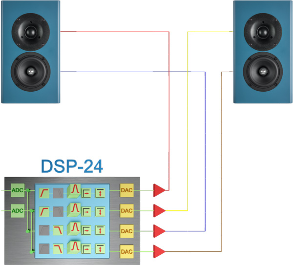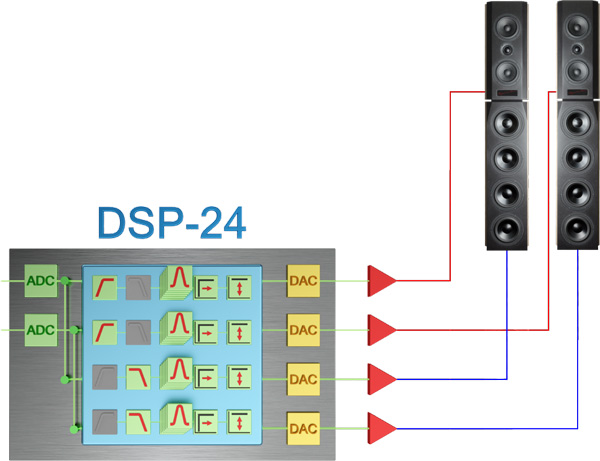 Das linke Bild zeigt den schematischen Aufbau vom audaphon DSP-24. Im Eingangsbereich wandeln die Analog-Digital-Konverter (grün) das analoge Signal in ein digitales Signal um. Der Digital-Signal-Prozessor (blau) verarbeitet die Daten nach der eingestellten Konfiguration. Diese Konfigurationen können aus Pegelanpassungen, Frequenzübergängen und parametrischen Equalizer-Einstellungen bestehen und beliebig kombiniert werden. Der DSP-Chip ist auch für die Lautstärkeregelung zuständig. Der Digital-Analog-Konverter (gelb) wandelt die bearbeiteten digitalen Signale aus dem DSP in analoge Signale um. Diese analogen Signale werden anschließend an die Verstärker (rot) weitergeleitet.