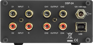 Audaphon DSP-24 ist ein 4-Wege Digitaler Signal Prozessor, der zwei Eingänge und vier Ausgänge hat.