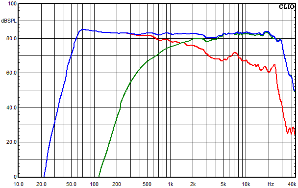 - Blau = Summe aus Hochtöner, Mitteltöner und Tieftöner auf Achse gemessen