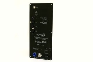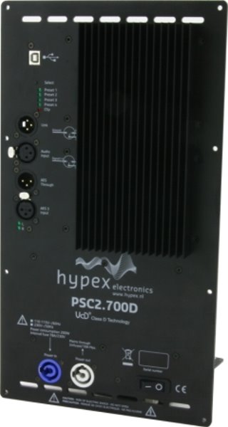 The PSC2 is a plate amp for use in powered speaker systems. As an active speaker controller, a PSC2 can form the basis of a powerful active two-way monitor. Figure 1 shows the audio path of the PSC2. The module has two 700Watt UcD modules implemented and is also available with a digital audio input AES/EBU, called the PSC2.700d version. The supply voltage is provided by a Switched Mode Power Supply (SMPS1200) module, also a module from Hypex Electronics. A PC controls the PSC2 through the USB port. This connection is used to upload the configuration and filter settings. It will also be possible to update the firmware through USB.