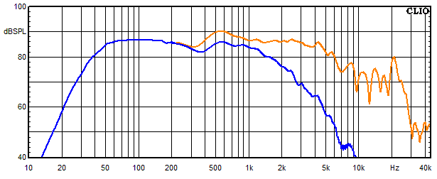 - Blau = Summe aus Hochtöner und Tieftöner auf Achse gemessen
