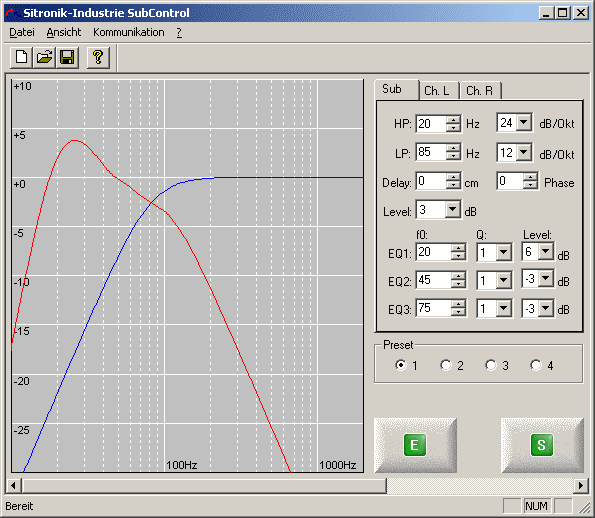 Picture 2: recording by the PC software supplied with the Sitronik module. With this software package the frequency response may be adjusted and then downloaded to the amplifier module (red curve: frequency response of the subwoofer, blue curve: the satellites - in this case congruent).