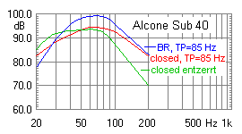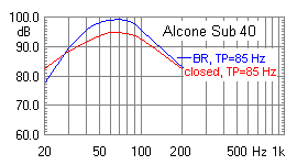 Picture 1: frequency response of Sub 40 at 85 Hz upper crossover frequency as closed cabinet (red curve), and as bass reflex cabinet (blue curve)