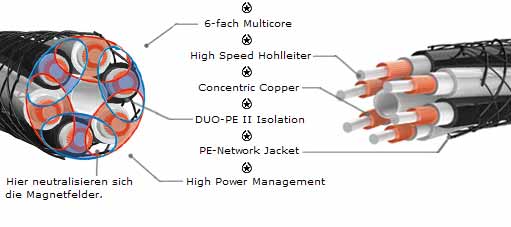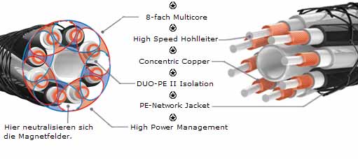 Der kleine Bruder des LS-1203 verfügt über einen 8-fach Multicore-Aufbau. Wie bei den anderen Kabeln der 3. Generation, hält das straff aufgebrachte PE-Network Jacket die Adern kompakt zusammen und reduziert Mikrovibrationen (High Power Management), die im Kabel durch die im Takt der Musik wechselnden Magnetfelder entstehen. Es überträgt daher auch hohe Pegel und extreme Dynamikspitzen mit äußerster Präzision.