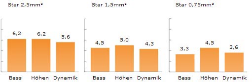 Jedes Kabel hat abhängig von seiner Konstruktion und den verwendeten Materialien einen eigenen Charakter, der sich in der Klangfarbe wiederspiegelt. Das Diagram zeigt welche Klangeigenschaften das Kabel üblicherweise entfaltet und wo seine Stärken liegen. Der angegebene Zahlenwert basiert auf unseren Erfahrungen und Rechenmethoden. Sie ermöglichen den Vergleich verschiedener Produkte und geben eine Hilfestellung bei der Selektion.