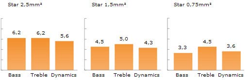 Each and every cable has its very own characteristic, even its own ?character?, which is relected in its very own timbre. This is because of its technical construction and the materials used for its manufacturing. The diagram shows how the described cable is positioned and where and what are its strong points. The indicated rating by numbers is based on our best knowledge and experience, as well as our own statistical calculations. It should give you some solid and easy to comprehend guideline, which should also be helpful to compare various products and to serve as a profound assistance for your selection and purchasing decision.