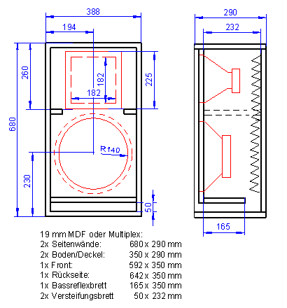 Für HiFi-Betrieb experimentierten wir mit Noppenschaum, der auf der Rückseite angebracht ist, außerdem noch 1 1/2 Pack Sonofil pro Box, durch letzteren reduziert sich die Belastbarkeit auf 300 Watt (Wärmeabfuhr!), jeoch meinten wir noch einen etwas ausgewogeneren Klang wahrzunehmen.