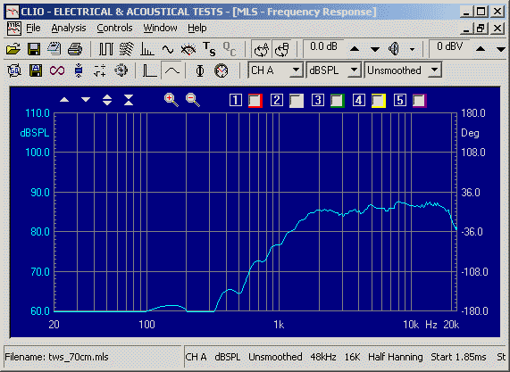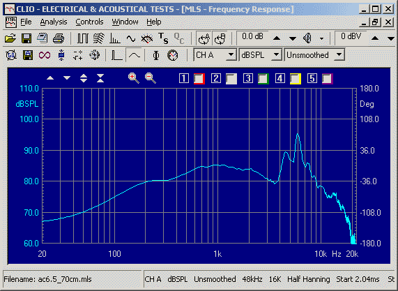 Dann wurde der Frequenzgang des Tieftöners Alcone AC 6.5 HE und der des Hochtöners im eingebauten Zustand in der Box gemessen - das ist sehr wichtig, da die Box den Klang (den Frequenzgang, die Phase) stark beeinflusst!