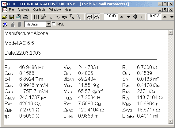 Die Messung ergab: Hiervon wichtig sind die Resonanzfrequenz f0, das Äquivalenzvolumen Vas, die Güte Qts (oder Qes und Qms). Mit ihnen kann man den Tiefgang der Box und das passende Boxenvolumen errechnen.