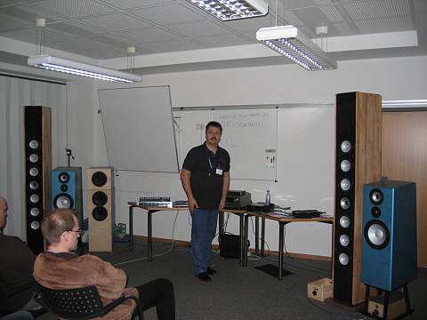 Im Bild links ist Herr Winterscheid zu sehen, der die neuesten und interessantesten Boxen-Projekte von HiFi-Selbstbau vorführt. Der Tieftöner in der Box rechts ist ein Alcone AC10 HE, der sehr gut an kam.