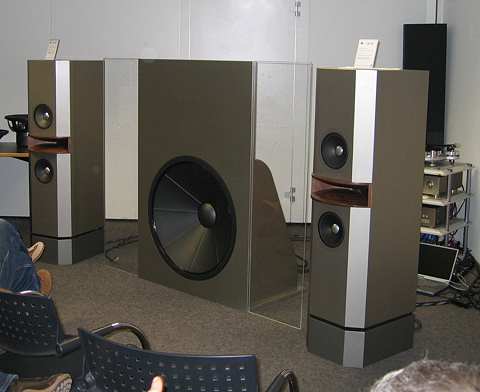 Das Motto ihrer online-Selbstbauzeitschrift (www.hifi-selbstbau.de) ist viel Lautsprecher für wenig Geld: - die passive Version der Referenz TRIO (ganz rechts) - die TAKE:SEVEN (daneben) ein monumentaler verblüffend günstiger Lautsprecher - Schließlich die TwoAndOne (unter der gekippten Tafel), die unseren Lesern schon bekannt ist. Im Bild links aus dem Raum von Mega Audio (fast alle Räume waren sehr interessant) ein Dipol Subwoofer mit 80 cm Tieftöner und zwei High-End-Frontboxen - alle drei mit Fostex Chassis bestückt.
