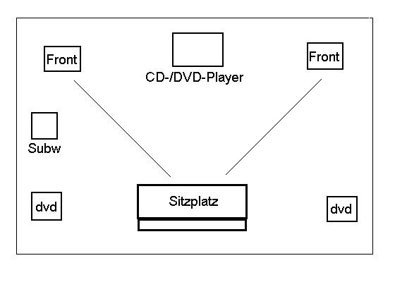 Spielt man DVDs ab, so kommen mindestens noch vorn ein Mittenlautsprecher, rechts und links vom Sitzplatz zwei Boxen für den Raumklang sowie ein Subwoofer hinzu. Sie alle müssen nach Frequenzbereich und Lautstärkeeinstellung zueinander passen, um den optimalen Raumklang einer DVD auszunutzen.