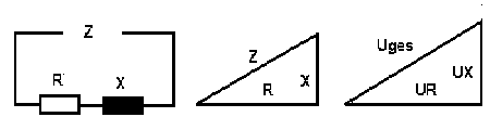 Der induktive Wechselstromwiderstand X = ωL einer verlustlosen Spule ist in der graphischen Darstellung senkrecht zum ohmschen Widerstand R anzuordnen. Daher ist Z nicht R + X, sondern die Wurzel aus der Summe der Quadrate beider Widerstände. Die Folge davon ist, dass auch die zugehörigen Spannungen von Spule und ohmschem Widerstand senkrecht zueinander anzuordnen sind. Dabei gilt für die Spannungen ein zu den Widerständen proportionales Dreieck mit der Trafospannung Uges sowie UX an der Spule und UR am Widerstand R.