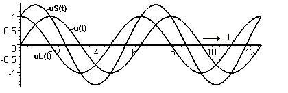 Dass die Widerstände R und XL rechtwinklig zueinander stehen, wird verständlicher, wenn man erkennt, dass auch Augenblickswerte der Wechselspannungen gegen einander zeitlich verschoben sind. Das folgende Bild zeigt die sinusförmigen Spannungen an einer Serienschaltung von Spule und Widerstand mit der Eingangsspannung uS(t), der Spannung am ohmschen Widerstand u(t) und der gegen u(t) um 90o voraus eilenden Spannung uL(t) an einer verlustlosen Spule. Man sieht, die Summenspannung uS(t) ist nur das Wurzelzweifache der Einzelspamnnungen und nicht deren doppelter Wert: