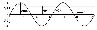 Hier der zeitliche Verlauf einer sinusförmigen Spannung mit der Amplitude (Ampl) und dem Effektivwert Uef: