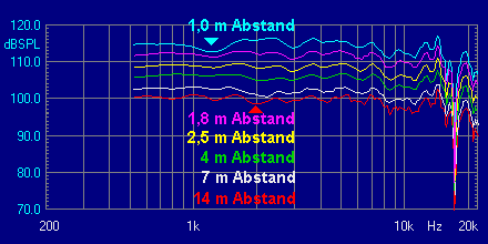 After extensive design work the dependency is perfectly low: At 1 metre distance a small irregularity becomes apparent at approx. 1.3 kHz, that doesn't become much more prominent at 14 metres distance at 2 kHz (refer to arrows).