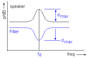 Please note: the calculated level drop in the frequency response is only correct, if the entered loudspeaker impedance matches the measured value. At the resonance frequency this is surely not the case; here, the level drop is a lot less severe, since the impedance of the speaker is higher.